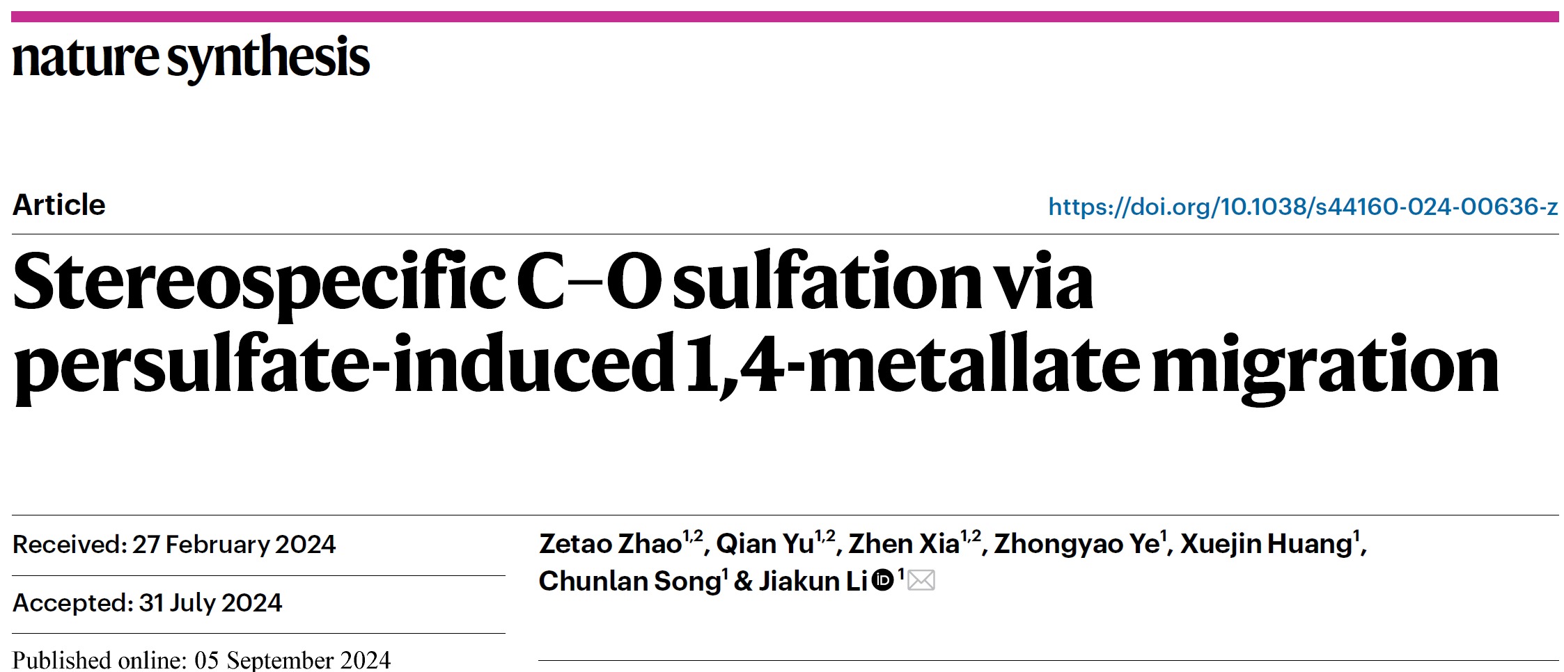 2024/09/10化學(xué)化工學(xué)院李家昆教授課題組在硫酸化領(lǐng)域取得重要進(jìn)展硫酸化是生物體內(nèi)重要的翻譯后修飾,參與生命的所有過程,與人類健康和疾病密切相關(guān)。硫酸鹽結(jié)構(gòu)與功能的高度復(fù)雜性賦予其巨大信息容量,目前無法通過遺傳密碼簡單推衍。因此,硫酸化研究成為后基因組時(shí)代的重要...