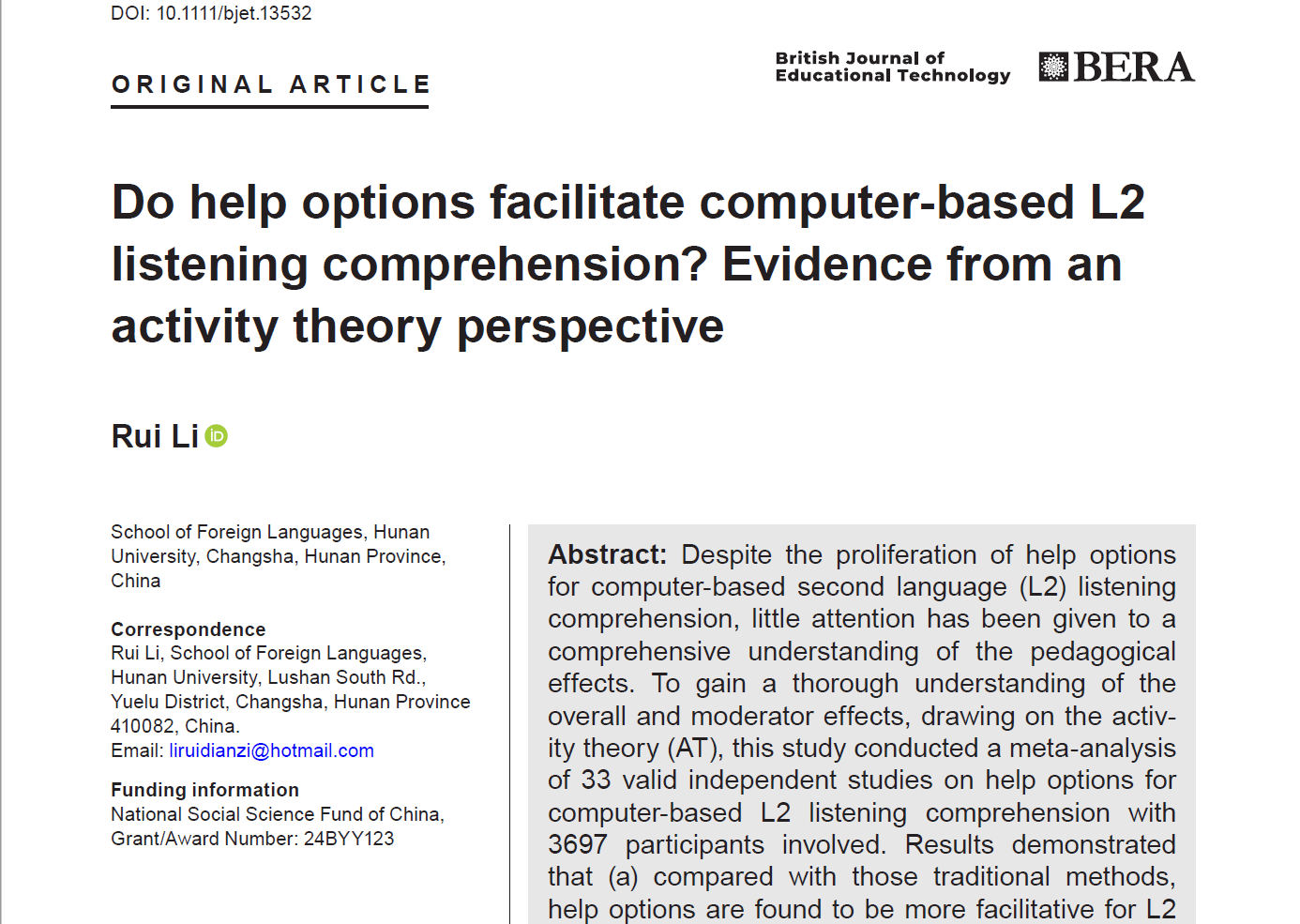 2024/11/13外國語學(xué)院李銳教授研究成果在教育學(xué)頂級(jí)期刊發(fā)表近日,外國語學(xué)院李銳教授在外語教育學(xué)研究領(lǐng)域中取得新進(jìn)展。該研究以“Do help options facilitate computer-based L2 listening comprehension? Evidence from an activity theory perspective”為題,發(fā)表于...
